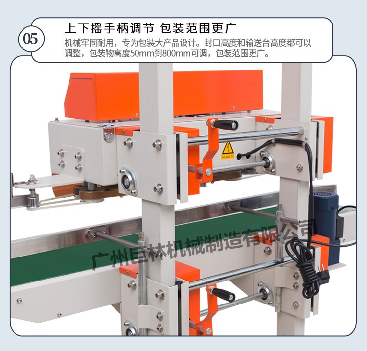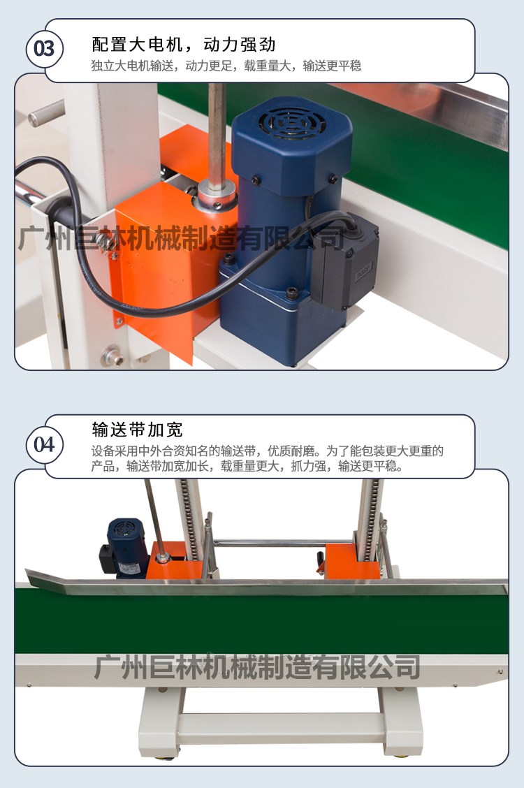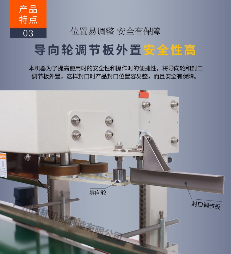 7包裝物進(jìn)入輸送臺時必須貼著護(hù)欄,包裝袋口一旦被引導(dǎo)帶拖入后,輸送帶與封口傳動同步進(jìn)行封口包裝,此時請不要對包裝物任意推動或阻擋,以免造成封口效果不良。
